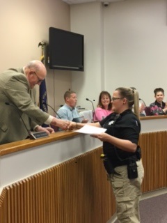 During the Sept. 5, 2017 meeting of Hopkins County Fiscal Court, State Rep. Melinda Gibbons Prunty, left, presented Fiscal Court with a citation congratulating the county on the successful opening of the West Kentucky ATV Park. Accepting the citation on behalf of the court is Judge-Executive Donald Carroll, right.